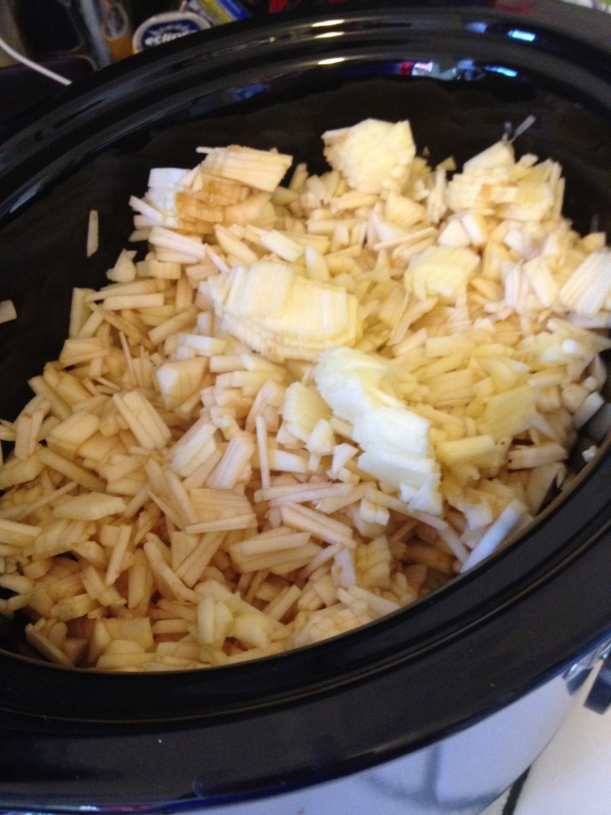 Fill your crock pot up with all your diced apples. I did not measure the apples in cups or pounds or even how many apples I peeled. It is full to about an inch and a half from the top.